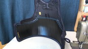 胸は人気のある牛紺革にシンプルな飾りで飽きのこないデザインで仕上げました。